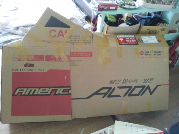 이런 식으로 박스 포장되어 도착하구요 우선 도착하고 포장을 풀면 안장 & 핸들 & 페달은 직접 조립을 해야 합니다
